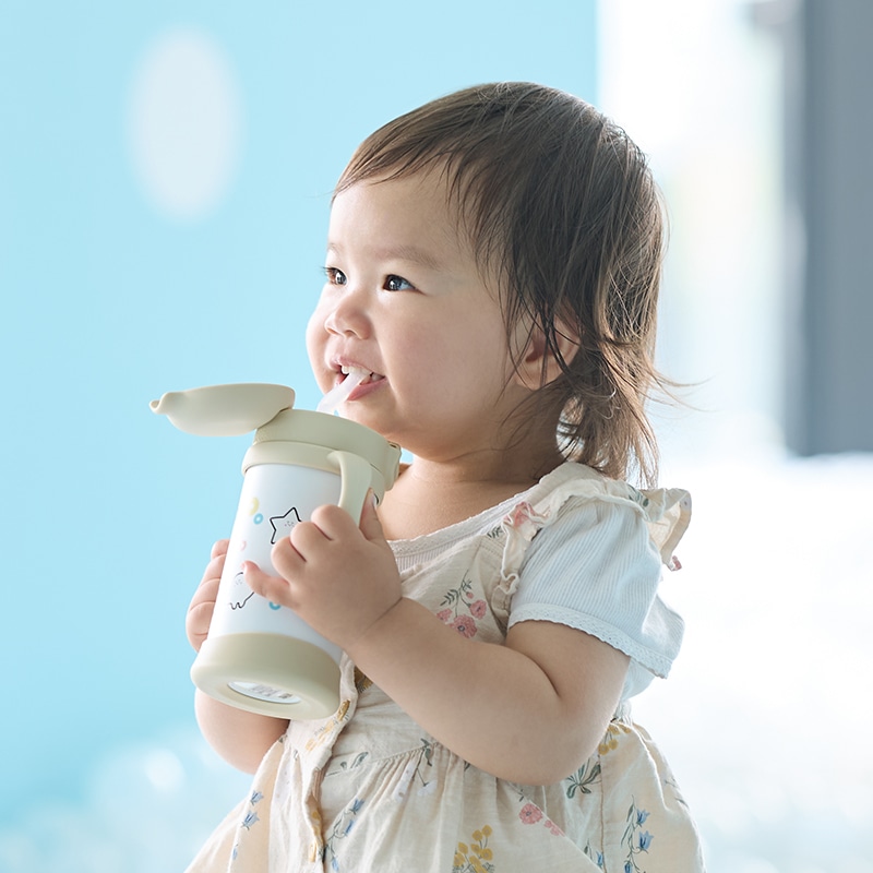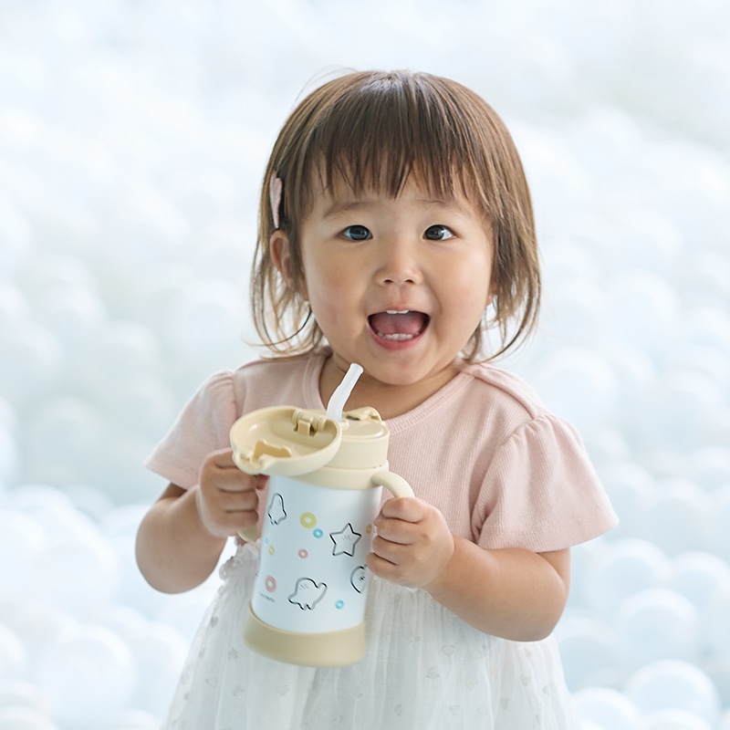 赤ちゃんとその保育者の方の日常を楽しいデザインでサポートする、販売店限定アイテムです。飲み口とパッキンが一体構造だからお手入れもラクラク!魔法びん構造だから冷たさをキープ。交換用ストローセット付き。