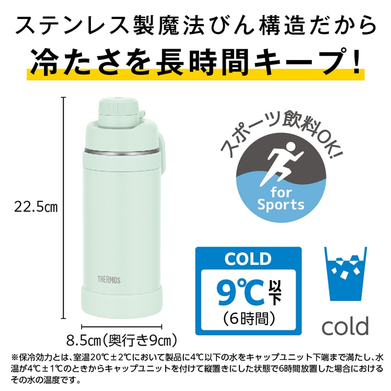 ●保冷効力とは、室温20℃±2℃において製品に4℃以下の水をキャップユニット下端まで満たし、水温が4℃±1℃のときからキャップユニットを付けて縦置きした状態で6時間放置した場合におけるその水の温度です。