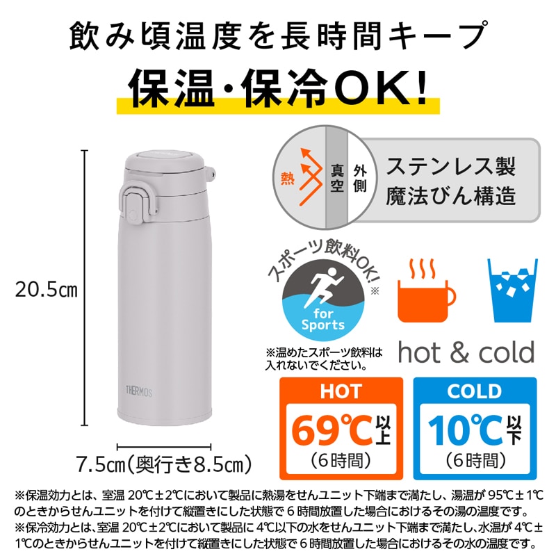 ●保温効力とは、室温20℃±2℃において製品に熱湯をせんユニット下端まで満たし、湯温が95℃±1℃のときからせんユニットを付けて縦置きにした状態で6時間放置した場合におけるその湯の温度です。