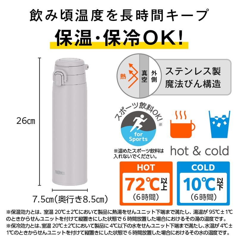 ●保温効力とは、室温20℃±2℃において製品に熱湯をせんユニット下端まで満たし、湯温が95℃±1℃のときからせんユニットを付けて縦置きにした状態で6時間放置した場合におけるその湯の温度です。