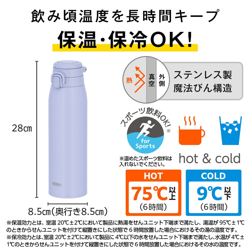 ●保温効力とは、室温20℃±2℃において製品に熱湯をせんユニット下端まで満たし、湯温が95℃±1℃のときからせんユニットを付けて縦置きにした状態で6時間放置した場合におけるその湯の温度です。