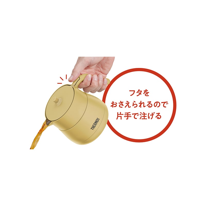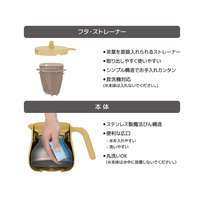茶葉を直接入れられるストレーナー付きのティーポットです。本体はステンレス製魔法びん構造だから、つくった飲みものをそのまま保温・保冷OK。フタがおさえられるので片手でも注げ、約カップ2~3杯分のお茶がつくれます。