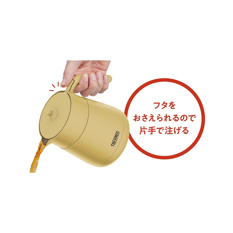 茶葉を直接入れられるストレーナー付きのティーポットです。本体はステンレス製魔法びん構造のため、つくった飲みものをそのまま保温・保冷OK。フタがおさえられるので片手でも注げ、約カップ3~5杯分のお茶がつくれます。