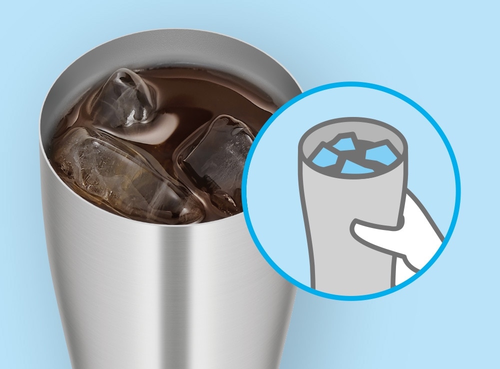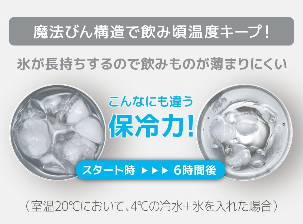 魔法びん構造だから氷が長持ち。飲みものが薄まりにくい。