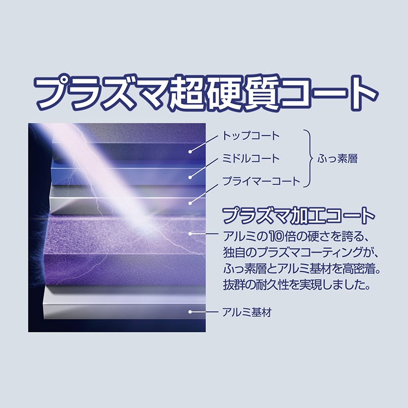 17,000℃※の超高温プラズマジェットでコーティング。ふっ素コートとフライパンの密着性を高め、抜群の耐久性を実現しました。※コーティング時のプラズマジェットの電子温度